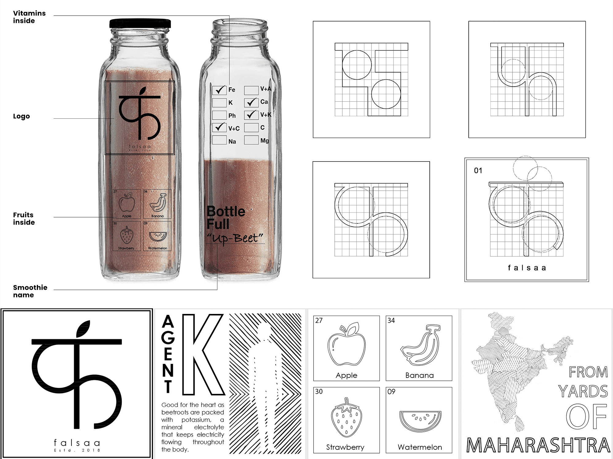 The logo design is inspired the letter "F" written in devanagari font. As the first letter of the brand it is derived by intersecting the most basic gemetric shapes. Symbolising the power of simplicity and purity. The lable design shown below highlights the main vitamin present in the certain bottle promoting contious comsumption.